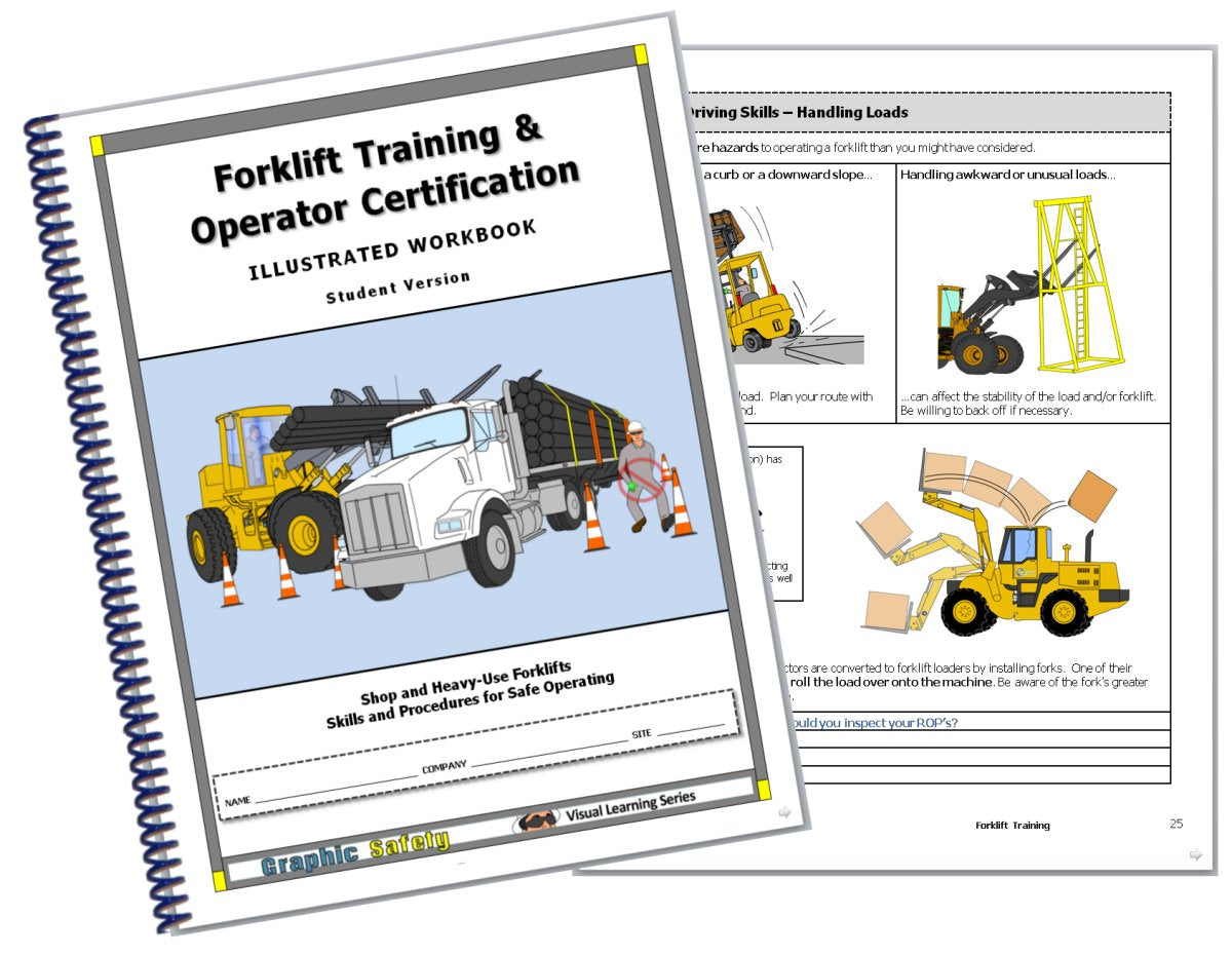 OSHA required safety training in a convenient Workbook. Employee driven - meaning that if you give a copy to the employee he can complete all 5 scenario exercises within, take the test in the back and then must get a Supervisor to observe and document the operators hands-on skills. Classroom time is not necessary, therefore significantly reducing loss productivity (and associated costs) because each employee can complete the workbook and then individually be hands-on certified.